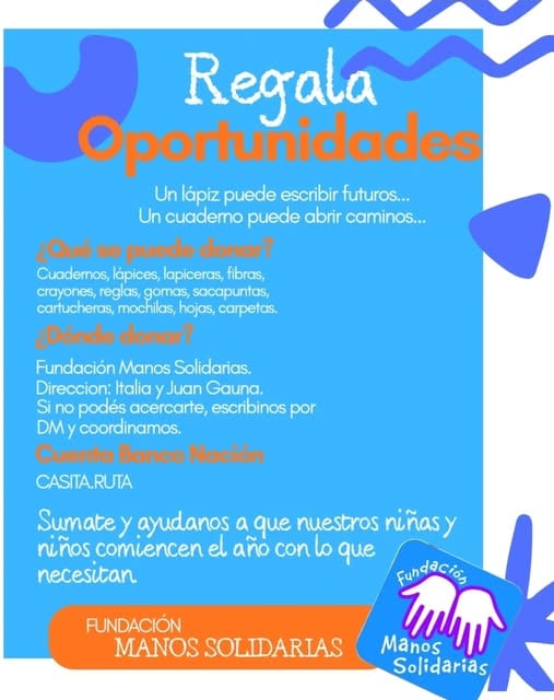 La Fundación Manos Solidarias puso en marcha una nueva iniciativa de recolección de materiales bajo el lema "Regalá Oportunidades". El objetivo principal es reunir artículos esenciales para que los niños y niñas puedan iniciar su escolaridad con las herramientas necesarias.