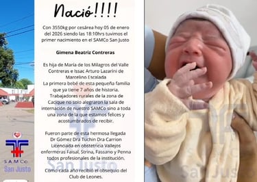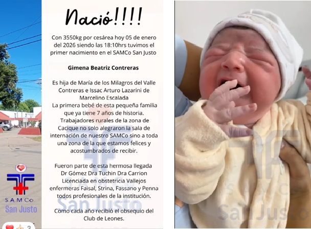 El SAMCo de San Justo celebró este lunes 5 de enero el primer nacimiento del año 2026. A las 18:10 horas, se produjo el arribo de Gimena Beatriz Contreras, una bebé que pesó 3,550 kilogramos y nació mediante una intervención de cesárea.