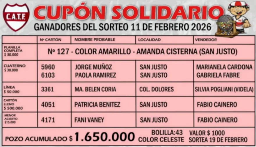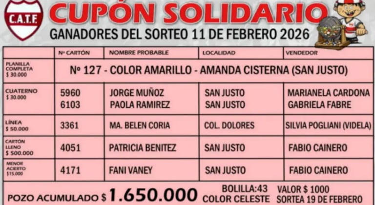 El Club Atlético Tiro Federal (C.A.T.F.) de la ciudad de San Justo llevó adelante una nueva edición de su Cupón Solidario el pasado miércoles 11 de febrero de 2026. En una jornada marcada por la expectativa de los participantes, la institución confirmó quiénes fueron los beneficiados en las distintas categorías de premios, que incluyeron desde planillas completas hasta el esperado cartón lleno.
