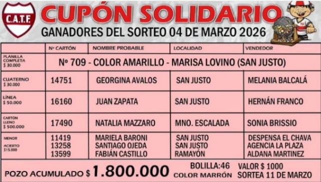 La estructura del sorteo "Cupón Solidario" del C.A.T.F. contempla diversas categorías de premios que benefician tanto a los compradores de los cartones como a los vendedores que colaboran con la institución. En esta ocasión, la nómina de ganadores se distribuyó de manera federal entre zonas aledañas, destacándose la participación activa de la comunidad de San Justo.