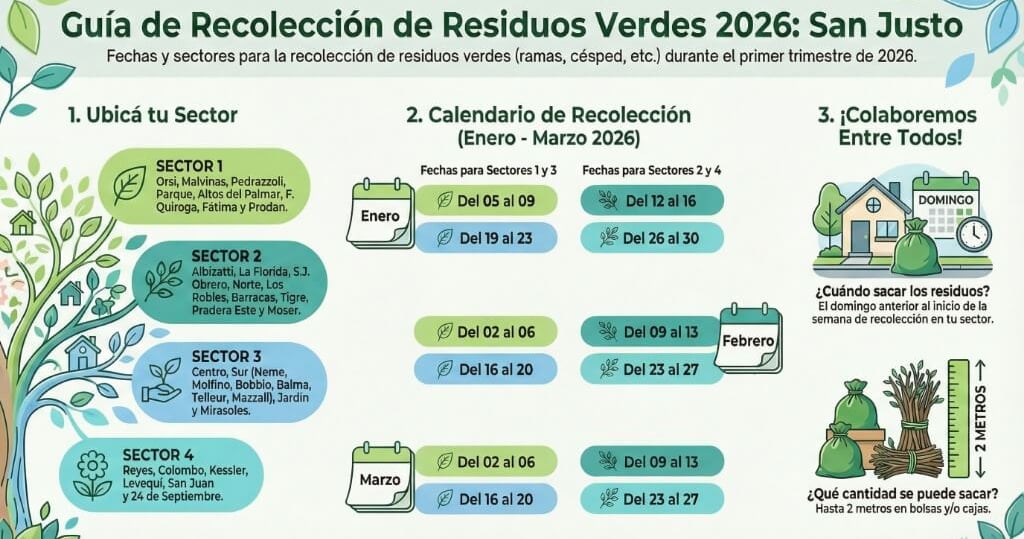 La Municipalidad de San Justo ha oficializado el calendario de recolección de Residuos Verdes (RV) correspondiente a los meses de enero, febrero y marzo de 2026. Con el objetivo de mantener la higiene urbana y optimizar el servicio, la ciudad continúa dividida en cuatro sectores estratégicos con fechas diferenciadas.