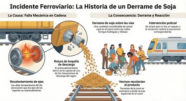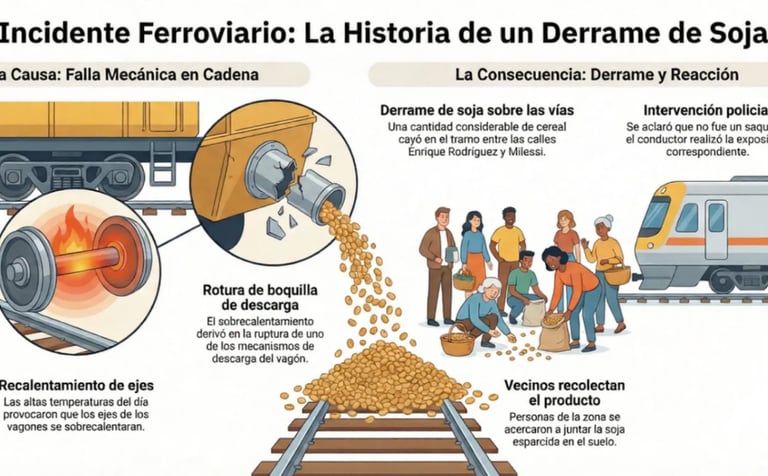 Un tren de carga que transportaba soja protagonizó un incidente técnico este miércoles en el tramo ferroviario comprendido entre las calles Enrique Rodríguez y Milessi. Debido a un desperfecto en la formación, una cantidad considerable de cereal quedó esparcida sobre el terreno, lo que generó el movimiento de personas en el sector.